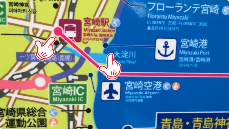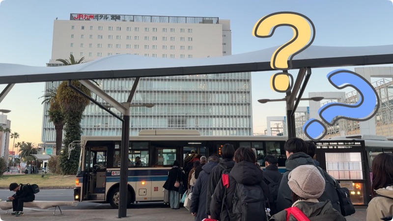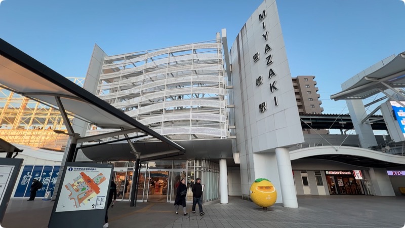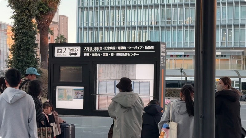出発は宮崎駅から。駅前のバス停(西2番乗り場)から宮崎港行きのバスに乗車します。