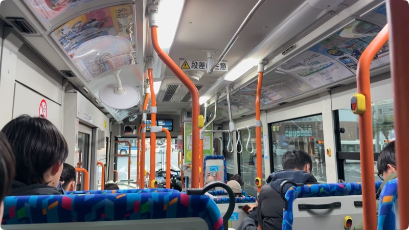 バスは本数が多く、スクリーンで運行状況も確認できますが、利用者も多いため注意が必要です。