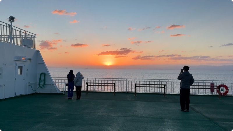 特に朝日が昇る瞬間は、フェリー旅ならではの魅力。神戸到着前には淡路島沖を航行し、景色の変化も楽しめます。